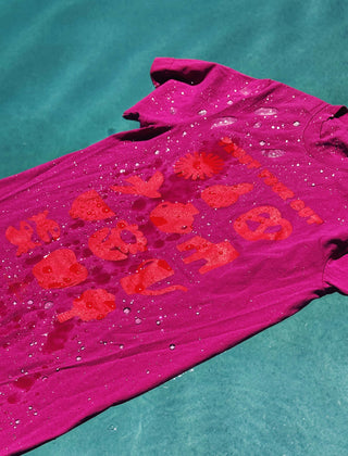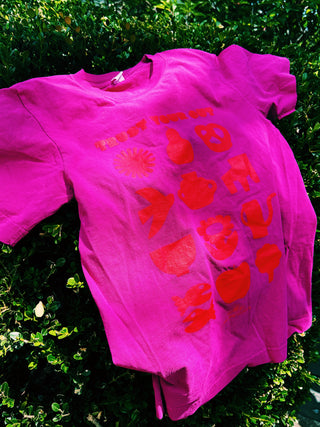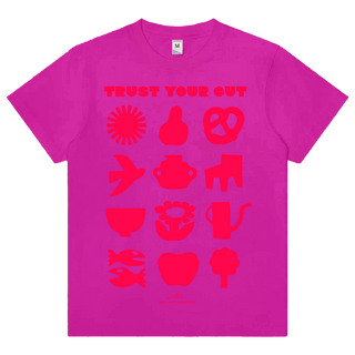 Trust your gut... this is going to be your new favorite tee. A sun, pear, pretzel, bird, pottery, chair, bowl, flower, pitcher, fish, apple and tree are printed in bright red on fuchsia short sleeve t-shirt. This high quality garment dyed tee is preshrunk and gets better with every wash. The "trust your gut" messaging is a reminder to listen to your intuition and act on your gut instincts. Limited edition.
